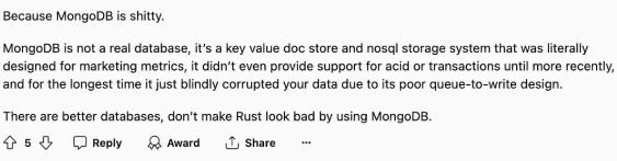有一个热评是:Rust 社区并不像他们假装的那样友好和冷静。更具体来说,我认为他们是一群自恋的家伙,尤其讨厌别人说 Rust 有缺陷。