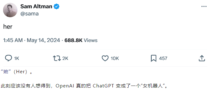 而本次演示的 ChatGPT,其声音几乎和电影里的“Her”一模一样——电影的女主角正是一款先进的人工智能操作系统 OS1,这个系统具有高度发达的人格化特征,并自称萨曼莎(Samantha)。OpenAI 用非常浪漫的方式完成了一次致敬。