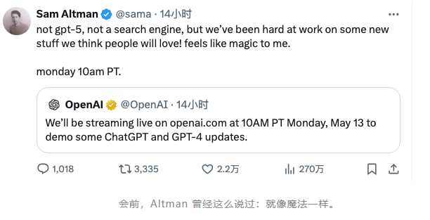 会前,OpenAI 首席执行官(CEO)萨姆·奥特曼(Sam Altman)神秘兮兮地发了一条推文,给整个发布会奠定了基调: