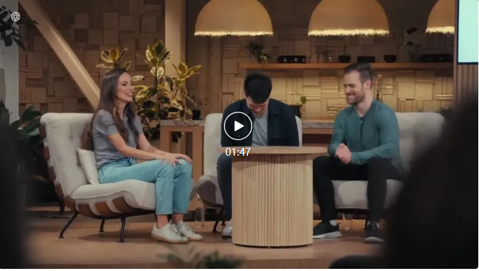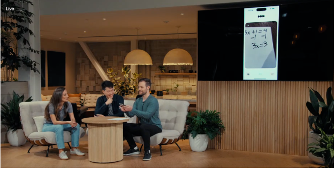 GPT-4o 还改进了 ChatGPT 的视觉能力。ChatGPT 现在能“看见”事物并进行推理。通过手机摄像头,她看到了一道写在纸上的数学题,并帮助两位演示者解题: