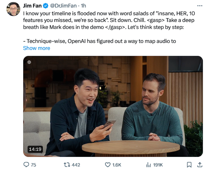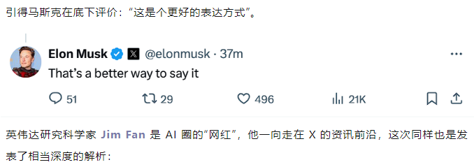 英伟达研究科学家 Jim Fan 是 AI 圈的“网红”,他一向走在 X 的资讯前沿,这次同样也是发表了相当深度的解析: