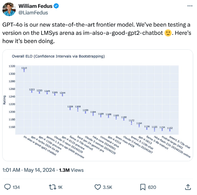 Fedus 表示,前段时间在“AI 竞技场” LMSys 打遍天下无敌手的“im-also-a-good-gpt2-chatbot”,其实就是 GPT-4o!并且,Fedus 还公布了一则更详细的数据: