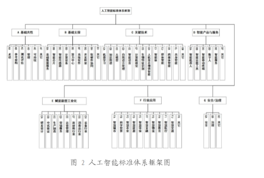 人工智能标准体系框架主要由基础共性、基础支撑、关键技术、智能产品与服务、赋能新型工业化、行业应用、安全/治理等7个部分组成,如图2所示