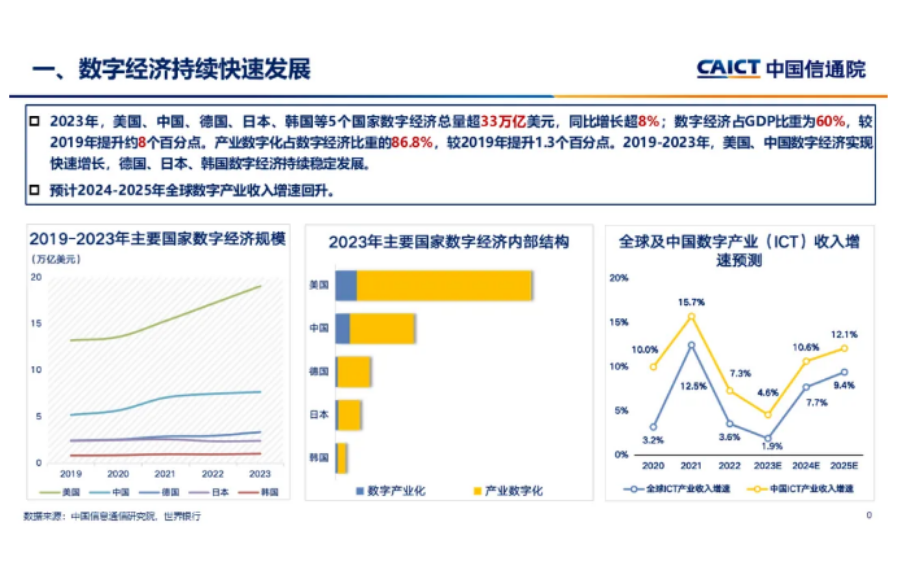 主要国家数字经济持续快速发展。总体看,2023年,美国、中国、德国、日本、韩国等5个国家数字经济总量超33万亿美元,同比增长超8%;数字经济占GDP比重为60%,较2019年提升约8个百分点。2019-2023年,德国、日本、韩国数字经济稳定发展,美国、中国数字经济实现快速增长。内部结构看,产业数字化对数字经济增长的引擎作用持续发挥,2023年占数字经济比重达86.8%,较2019年提升1.3个百分点;预计2024-2025年,全球数字产业收入增速回升,稳步夯实数字经济发展基础。